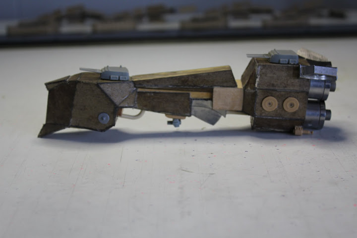This is my first crack at a spaceship. The model is similar to the Spider Walker, in that it's made of chipboard. This time I coated the Chipboard in resin. When painted it should radiate more of a metallic sheen than just the porous chipboard would. This is the first time I've tried this method. The accessories are from an old battleship model I had in my basement along with pieces from a garbage picked stereo and some plastic model sprues. Later, I will post the finished painted spaceship.